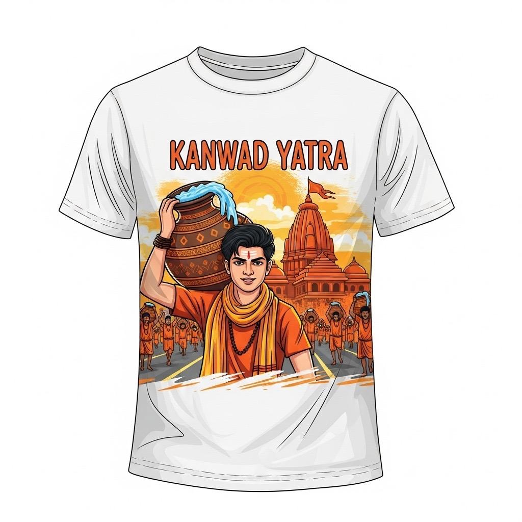 - 🎨 आकर्षक डिज़ाइन: टी-शर्ट पर बना चित्र एक युवा कांवड़िये, पृष्ठभूमि में मंदिर और गंगाजल के साथ – एक जीवंत और प्रेरणादायक दृश्य।
