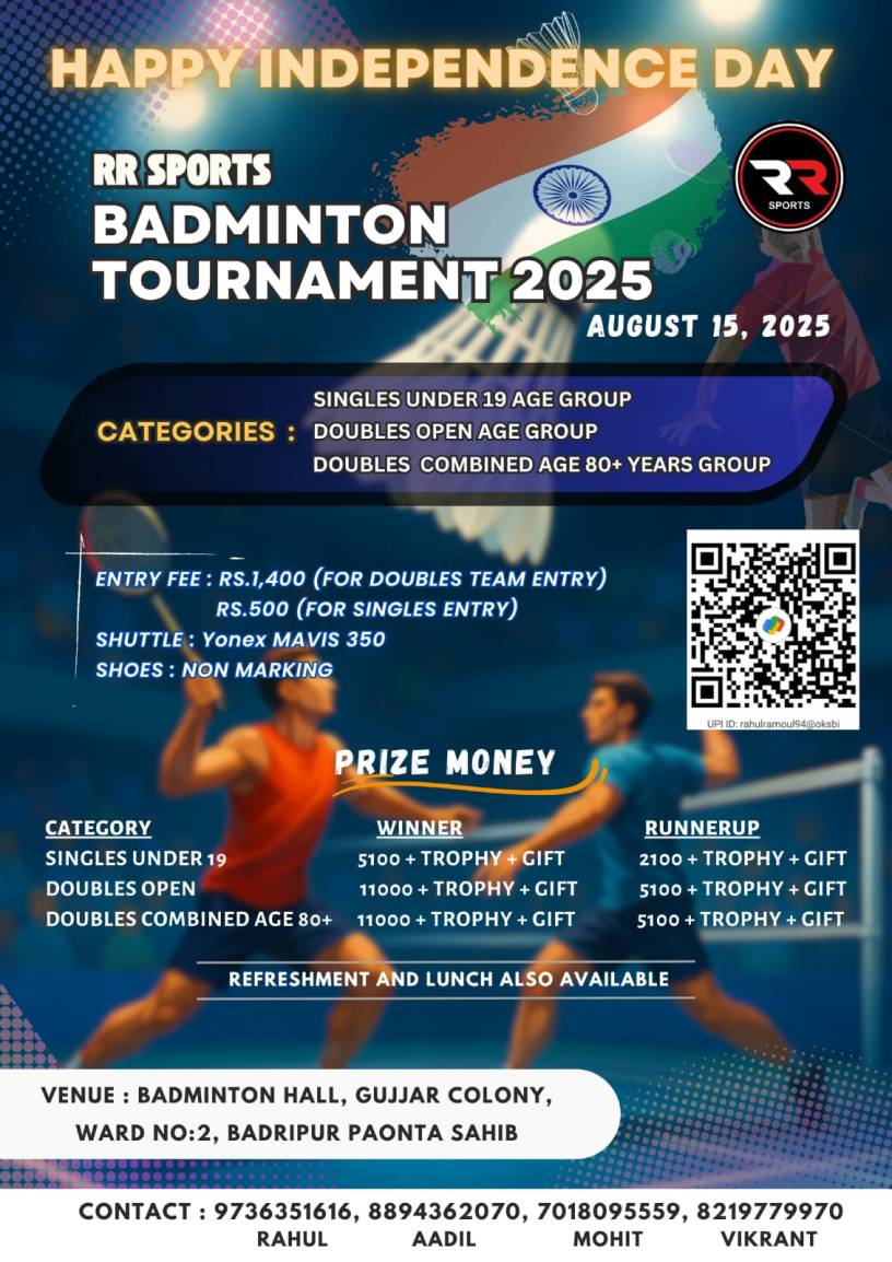 RR Sports Badminton Tournament 2025 केवल एक टूर्नामेंट नहीं, यह एक अनुभव है – जहाँ सावन की ठंडी हवा, बैडमिंटन की गूंज और देशभक्ति का जोश सब एकसाथ मिलता है।