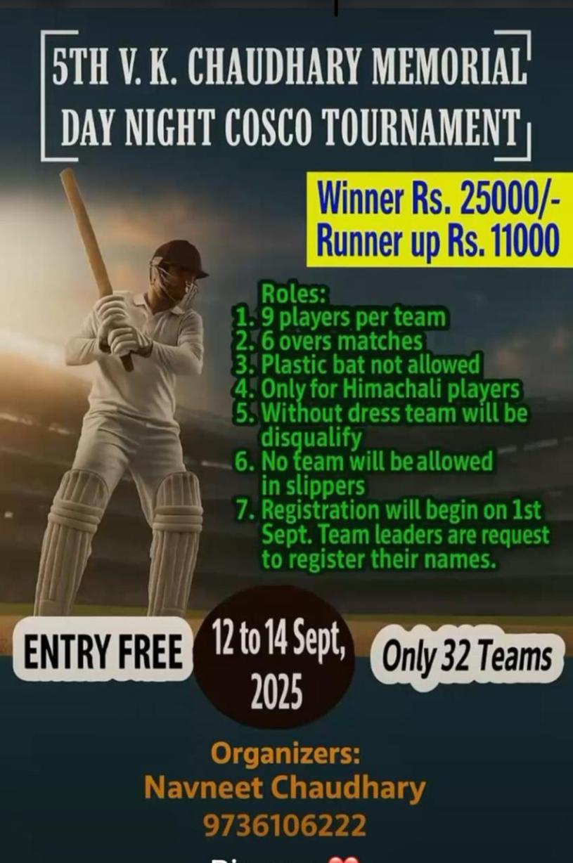 अपनी टीम बनाएँ, तारीखें नोट करें और समय पर पंजीकरण कराएँ — यह है आपका मौका वी. के. चौधरी मेमोरियल टूर्नामेंट में अपनी पहचान बनाने का।