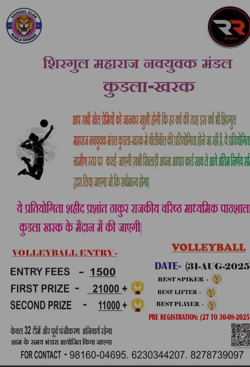рд╢рд┐рд░рдЧреБрд▓ рдорд╣рд╛рд░рд╛рдЬ рдирд╡рдпреБрд╡рдХ рдордВрдбрд▓ рдХреБрдбрд▓рд╛-рдЦрд░рдХ рджреНрд╡рд╛рд░рд╛ рд╣рд░ рд╡рд░реНрд╖ рдХреА рддрд░рд╣ рдЗрд╕ рд╡рд░реНрд╖ рднреА рднрд╡реНрдп рд╡реЙрд▓реАрдмреЙрд▓ рдкреНрд░рддрд┐рдпреЛрдЧрд┐рддрд╛ рдХрд╛ рдЖрдпреЛрдЬрди рдХрд┐рдпрд╛ рдЬрд╛ рд░рд╣рд╛ рд╣реИред рдпрд╣ рдкреНрд░рддрд┐рдпреЛрдЧрд┐рддрд╛ рди рдХреЗрд╡рд▓ рдЦрд┐рд▓рд╛рдбрд╝рд┐рдпреЛрдВ рдХреА рдкреНрд░рддрд┐рднрд╛ рдХреЛ рд╕рд╛рдордиреЗ рд▓рд╛рдПрдЧреА рдмрд▓реНрдХрд┐ рдЧреНрд░рд╛рдореАрдг рд╕реНрддрд░ рдкрд░ рдЦреЗрд▓ рднрд╛рд╡рдирд╛ рдФрд░ рднрд╛рдИрдЪрд╛рд░реЗ рдХреЛ рднреА рдордЬрдмреВрдд рдХрд░реЗрдЧреАред